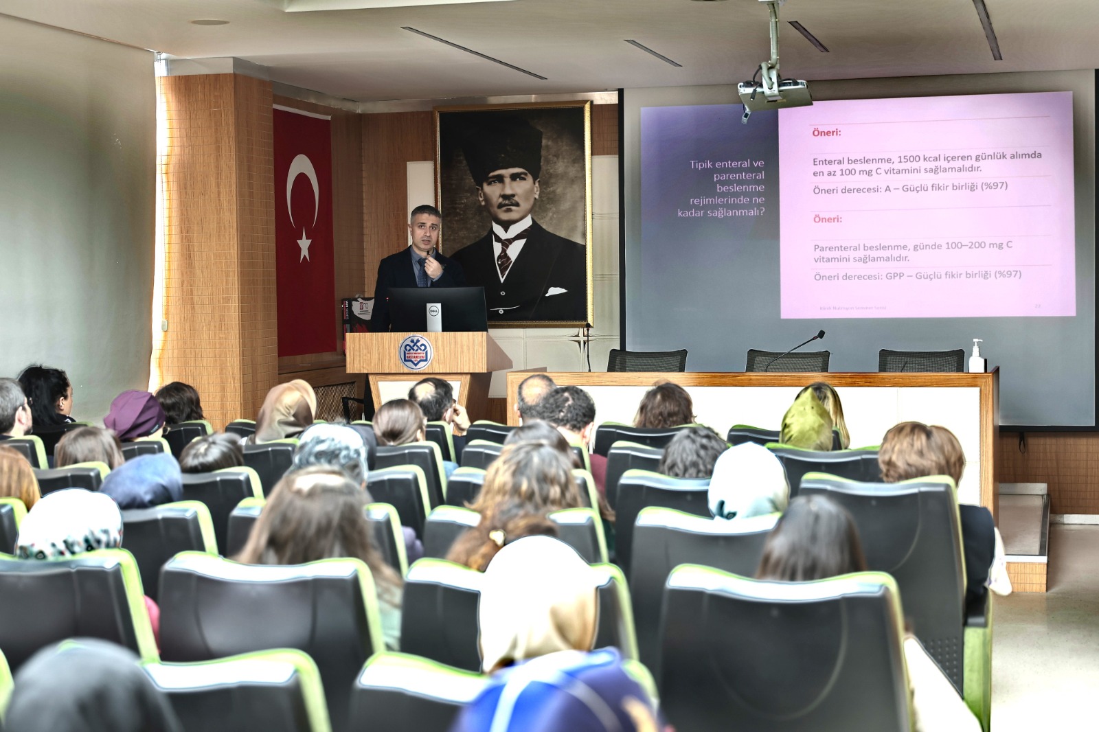Tıp Fakültesi İç Hastalıkları Yoğun Bakım Bilim Dalı Başkanı Doç. Dr. Şahin Temel, Kritik Hastalarda Mikronutrient Takibinde; tiamin, C vitamini, selenyum, bakır, çinko ve D vitamini eksikliklerinin klinik önemine değindi. Seminere; öğretim üyeleri, hekimler ve diğer sağlık çalışanları katıldı.