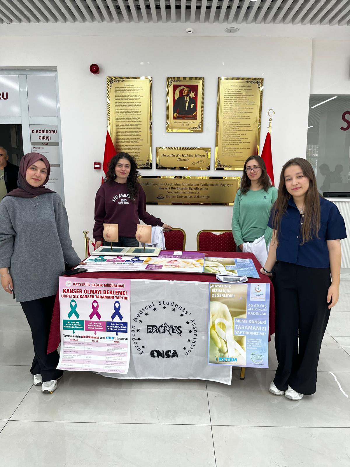 Erciyes Üniversitesi (ERÜ) Tıp Fakültesi Gevher Nesibe Hastanesi Poliklinikler Girişinde Genel Cerrahi AD. Araştırma Görevlisi Dr. Cihan Biçer ve Erciyes Üniversitesi Tıp Fakültesi Öğrencilerinden oluşan Avrupa Tıp Öğrencileri Birliği (European Medical Students Association) Erciyes Kulübü olarak meme kanseri farkındalığını artırmak amacıyla ''Meme Muayenesi Nasıl Yapılır?'' konulu stant etkinliği düzenlendi.